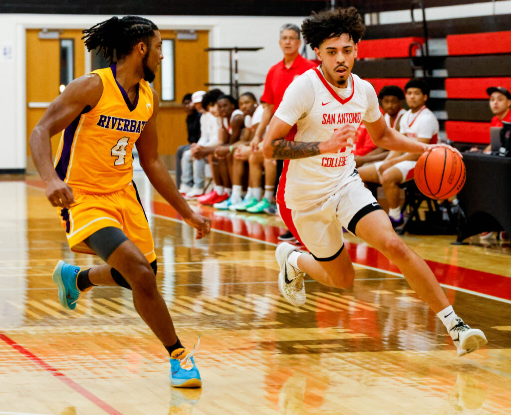 SAC Forward Jovan Jimenez drives past a Riverbats defender. Photo by Janelle Aleman.